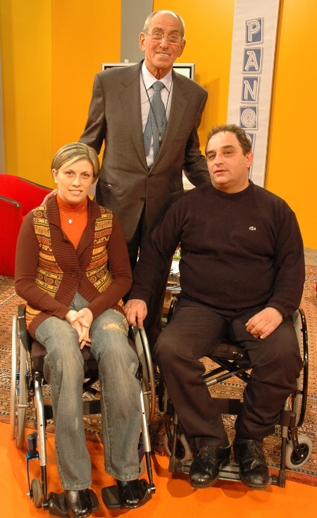 Giorgio Brunelli tra Gigliola Centurelli e Angelo Colombo, ospiti della trasmissione Panacea- Teletutto,  quali testimoni della ricerca sulle lesioni del midollo spinale.